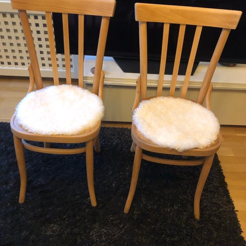 Använda men i fint skick. Sittdynor (helt avtagbara) från Åhlens i fårullsimitation medföljes!