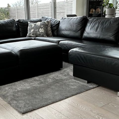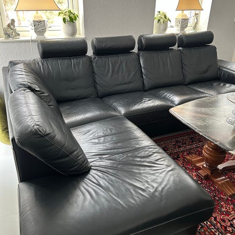 En stor äkta skinnsoffa. Har några år på nacken men är i bra skick. Köpt på Ekeby möbler.