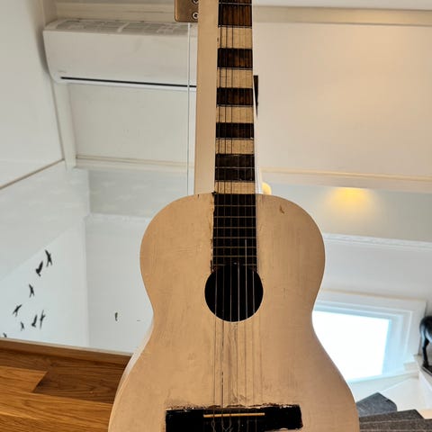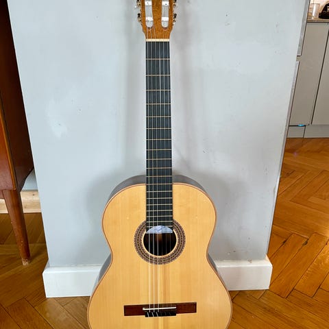 Gewa klassisk akustisk gitarr i naturfärgat trä. Gitarren har nylonsträngar, traditionell spansk huvudform och mekanik med vita stämskruvar. Lock i ljust trä med dekor runt ljudhålet och baksida/sidor i mörkare trä med tydlig ådring. Passar för klassisk gitarrspel, övning och allmän akustisk spelning. Gitarren har standard halsprofil för klassisk gitarr och helkroppsdesign utan cutaway. Den har små färgfläckar på sig och lite små repor men är annars i gott skick.