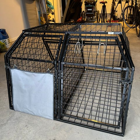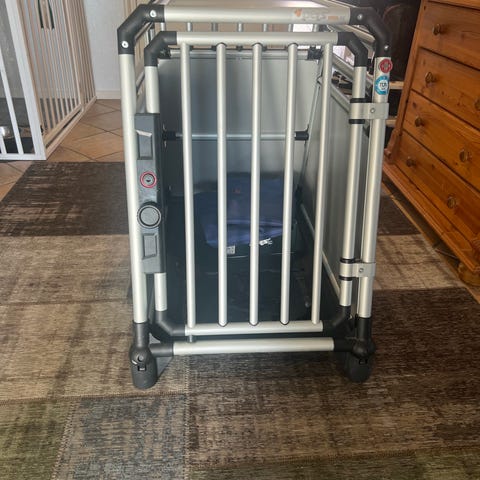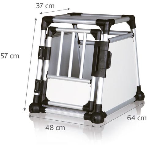 En transportbur för hundar upp till 27 kg, passar även 2 hundar, idealiskt utformad passform för bagageutrymmet, halksäkra termofiltar, med extra breda gallerstavar och en uttagbar skiljevägg, av aluminium.