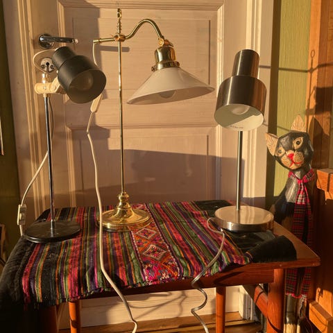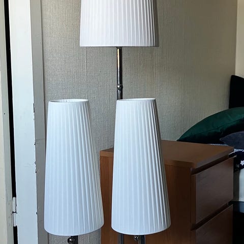 3 fina lampor i svartlackerat trä med kromdetaljer o hårdplast skärm. Lysrör i skärmen. Höjd 55 diameter 50 cm.