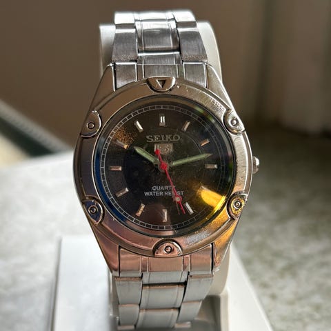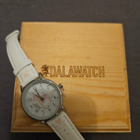 Unisex armbandsur med boett och länk i silverfärgat rostfritt stål. Urtavla i mörk färg med analoga visare och sekundvisare i avvikande färg. Länken har viklås märkt "stainless steel". Passar för vardagsanvändning av både damer och herrar.