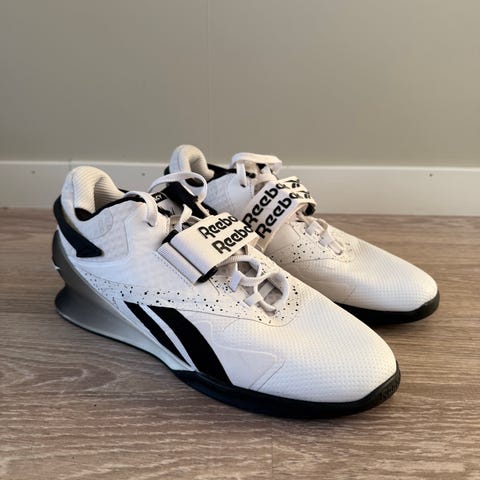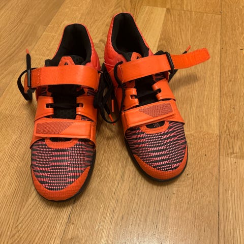 Adidas Adipower träningsskor i storlek 43. Skorna är orange med mönstrad ovandel och svarta detaljer. De har snörning kombinerat med justerbar rem över foten för extra stabilitet. Ovandelen är i textilmaterial med ventilerande mesh. Sulan är platt med gummiyta för bra grepp vid träning. Passar för olika typer av inomhus- och gymträning.