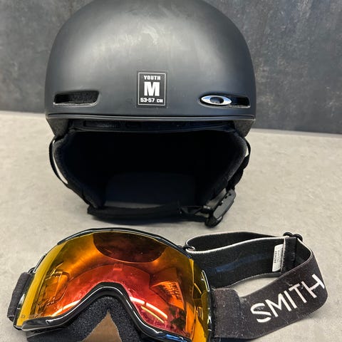 Skidhjälm, låg vikt, justerbar i storlek 55-59 cm. Inbyggda hörlurar som kan kopplas till smartphone. Färgen är grå metall. Skidglasögon Dr Zipe flerfärgad samt ny ljudkabel (USB-C till AUX 3,5 mm) ingår.