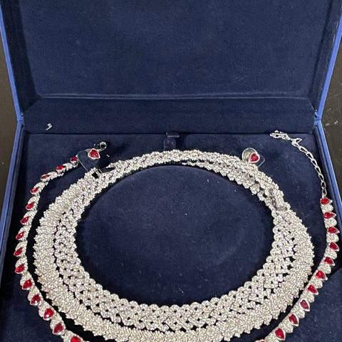 Säljer nu en ring i 9karats vitguld med swarovskikristaller tillsammans med ett par örhängen i 9karats vitguld med diamanter.
