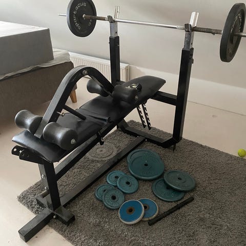 Träningsbänk med skivstång och vikter