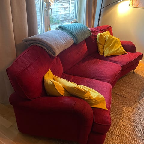 Vinröd Howardsoffa med fotpall. Bra skick. Hämtas i Långbro/ Fruängen på lördag