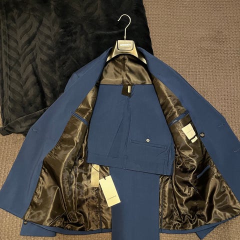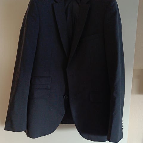 Kavajen är i storlek 52R (Regular), men passar som en 50 (byxornas storlek). Kostymen är tillverkad i ull men är mycket tunn och i ljus färg så den upplevs sval. Kostymen har endast använts till grundskoleexamen så den är mycket sparsamt använd. Kostymen är somrig, men formell i sitt uttryck.