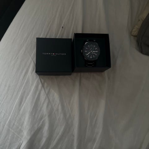 armbandsur för man med blått läderband och mörk urtavla. Klockan har kvartsurverk och analog visning med tim-, minut- och sekundvisare samt datumfönster. Boetten är i metall med vridring och baksida i rostfritt stål. Urtavlan är märkt med vattenresistens upp till 30 m. Läderbandet har struktur och kontrastsömmar samt klassiskt spänne i metall.
