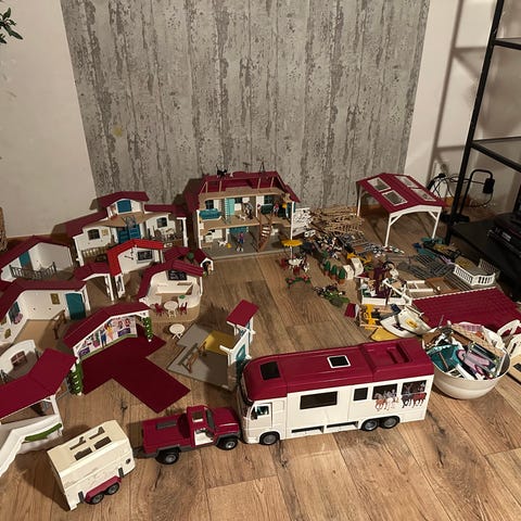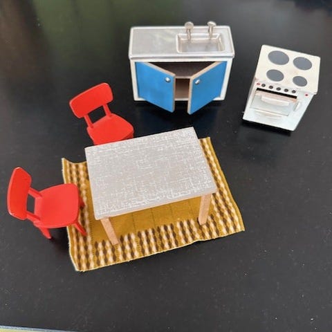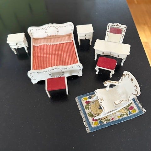 Dockskåpsmöbler från 50 början av 60-talet och tillbehör i plast och trä i blandade färger. Setet innehåller flera olika typer av möbler som stolar, bord, sängar, bänkar, toalett, badkar, köks- och vardagsrumsmöbler samt små tillbehör som serviser, kannor, fat och andra köks- och hushållsdetaljer. Passar till lek i dockskåp eller som samlarobjekt. Storleken är anpassad för mindre dockor och figurer. Sälens till högstbjudande