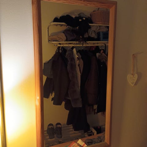 Rektangulär spegel med träram. Spegeln har en ram i trä med naturlig träfärg och kan användas stående mot vägg eller monteras på vägg beroende på upphängning. Passar i exempelvis hall, sovrum eller vardagsrum för helkroppsspegling och rumsförstoring.
