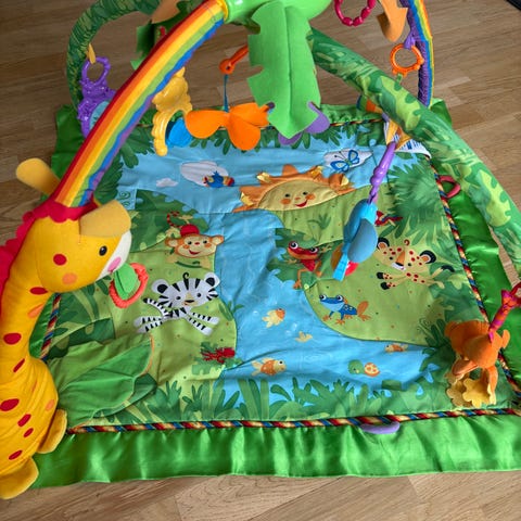 Fisher-Price babygym med mjuk lekmatta och bågar med hängande leksaker.