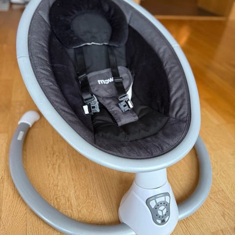 Använd till ett barn, fint skick. Snygg design, med en putt svingar den i några minuter av sig själv, babyskydd kan tas bort och den kan användas till fåtölj för barn upp till 60 kg.