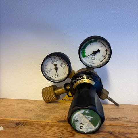 AGA Mison gasflaska på 5 liter med tryckregulator. Flaskan är märkt med Luxfer och har arbetstryck upp till 300 bar. Utrustningen inkluderar dubbelmanometer för avläsning av flasktryck och arbetstryck. Lämplig som skyddsgas vid svetsning och liknande användningsområden där Mison-gas används. Ingen gas kvar.