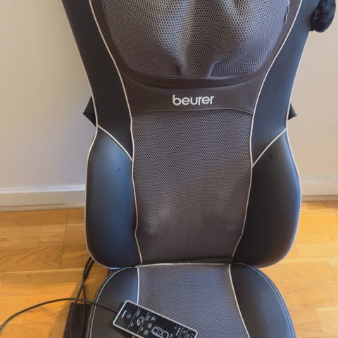 Massagekudde för rygg och säte i brun färg. Produkten placeras på en stol eller soffa och kopplas in med sladd. Den har vadderad sits och ryggdel med inbyggda massagezoner. Lämplig för avkopplande massage av rygg och säte i hemmet eller på kontoret.