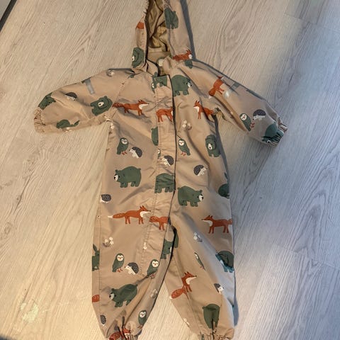 Lindex overall för barn i storlek 86. Overall i blå polyester med djurmönster, huva och förstärkta partier på knän. Tillverkaren anger att plagget är vattentätt 2000 mm, har tejpade sömmar och är vindtätt. Passar som unisex ytterplagg för mindre barn.