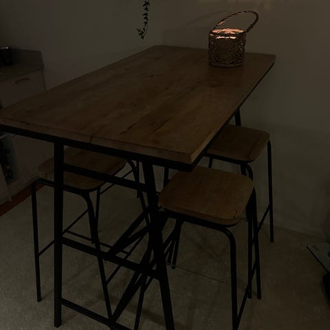 Ikea köksö formgivenmed massiv träskiva och svart underrede. Öppen förvaring med hyllplan under bordsskivan ger plats för köksredskap och varor. Passar som arbetsbänk eller matplats i kök eller allrum. Höjden gör den lämplig att använda tillsammans med barstolar. Finns att hämta på Kungsholmen. Barstolar tillkommer om man vill ha dom!