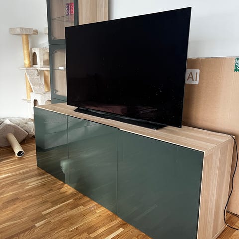 Säljer en Bestå byrå / tv-möbel / sideboard. Den är 120 cm bred och 48 cm hög, det går att skruva av benen och då blir den 38 cm hög. Toppskiva i glas, vita Lappviken-dörrar samt om önskas kan man få med två Lappviken vitlaserad ekeffekt-dörrar i nyskick. På baksidan, är det utskuret för kablar, det stör inte vare sig utseende då det inte syns eller funktion. Mycket gott skick.