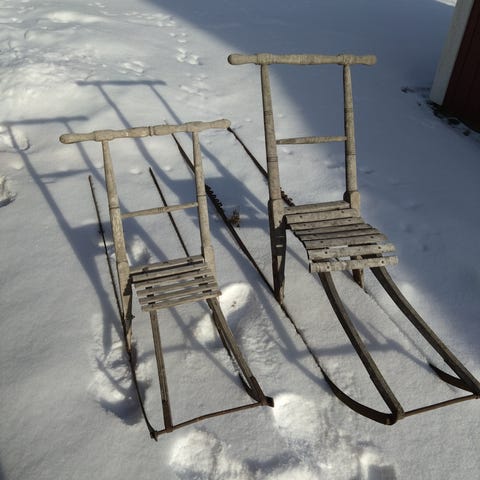 Sparkstötting i trä med metallmedar. Klassisk modell med trähandtag och träsits. Lämplig för användning på snö- och isbelagda underlag för enklare transporter eller fritidsåkning.