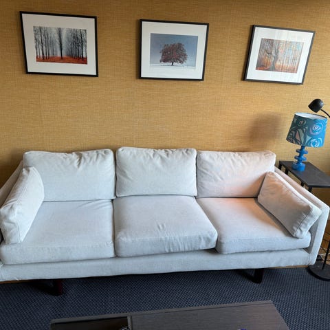 IKEA soffa i vitt tyg med löstagbar klädsel. Soffan har två sittdynor och två ryggkuddar. Mått: bredd ca 205 cm, sittbredd ca 180 cm, djup ca 88 cm, sitthöjd ca 44 cm och höjd ca 72 cm. Passar som 3-sitssoffa i vardagsrum eller liknande utrymme. Nytvättat tyg, soffan är ren och fräsch.