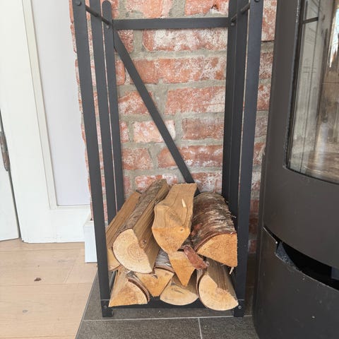 Svart vedställ med måtten H88 B 38 och djup 35