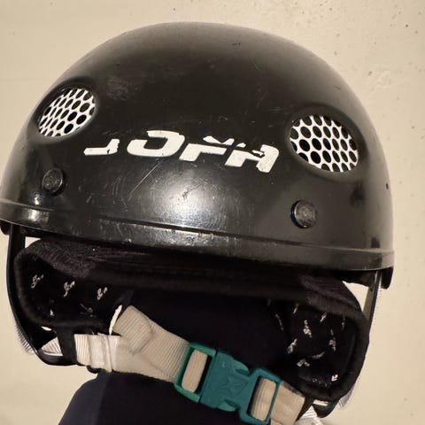 Jofa 715 LS hjälm i vit färg med blå ventilationsöppningar. Justerbart vred i nacken för anpassning av passform. Invändigt foder med mönster och hakrem med spänne. Lämplig som vid exempelvis skridskoåkning, cykling eller annan liknande aktivitet där huvudskydd behövs.