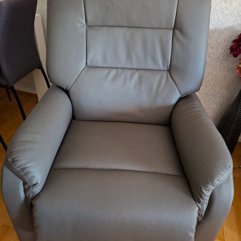 Säljer en mycket bekväm och välvårdad fåtölj i mörkgrönt läder köpt på Mio. Det här är den ultimata sittplatsen för filmkvällar eller läsning, med flera inbyggda funktioner för maximal avkoppling.