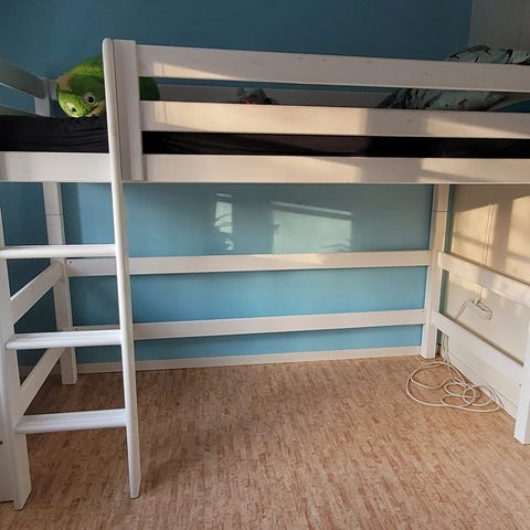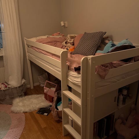 Loftsäng i vit färg. Sängen har stege på kortsidan och skyddande sidoräcken runt liggytan. Träribbotten ingår enligt bild, madrass ingår ej. Passar som barnsäng med utrymme under för förvaring eller lek. Med en extra madrass under är det perfekt om kompisar ska sova över! Även om det är en barnsäng tål ribborna tyngden av normalbyggd vuxen.