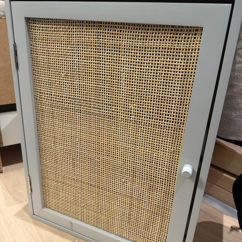 Skåp i pulverlackad plåt med stomme i metall. Två välvda dörrar som är klädda i flätad fanér. Dörrarna har metallhandtag och stängs med magnetlås. Tre fasta hyllplan i skåpet.