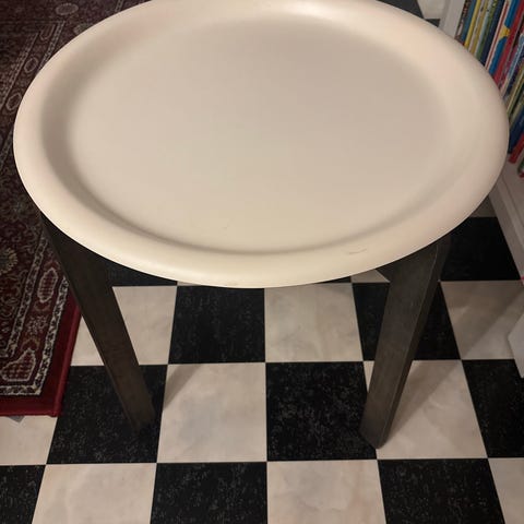 Ellos Brickbord i metall med en diameter på 57 cm och höjd på 31 cm. Bordet är i guld och har en avtagbar bricka med stativ. Passar som sidobord eller avlastningsbord. Säljes i befintligt bra skick.