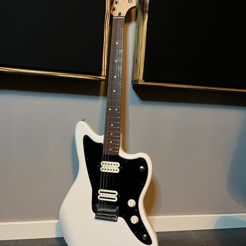 Finns några dings längs kanten men överlag i mycket fint skick, fräscha band och skön att spela på. Stallmicken är en hotrailkopia men låter precis lika bra! Lite fetare c-profil på halsen, riktig rosewoodbräda och alkropp av full tjocklek så perfekt att modda vidare på om man vill. Sällsynt att se vita yako-strator till salu så passa på om du vill ha ett bra ex. Gigbag medföljer.