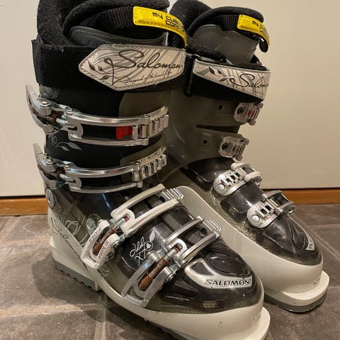 Salomon alpina pjäxor med sulmått 277 mm. Storleksmärkning 23–23,5. Färgkombination i vitt, svart och rött med röda innerskor. Utrustade med flera justerbara spännen i metall för stabil passform. Pjäxorna är i mycket fint skick.