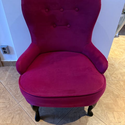 Ett par vinröda Emmafåtöljer med fint mönster. Lite skada i sömmen på ena fåtöljen men ingenting man tänker på (se bild 3,4).