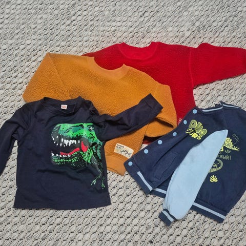 H&M barnkläder set i storlek 86 för unisex barn. Setet består av flerfärgade plagg i bomull. Tröjorna har motiv och text framtill och är stickade i mjukt material. Byxorna är i ett mjukt tyg med resår i midjan och knappar framtill. Passar vardagsbruk och inomhuslek för barn runt 12–18 månader, beroende på barnets längd och kroppsform. Materialet är bomull som är lätt att tvätta och sköta enligt tvättråden på plaggen.