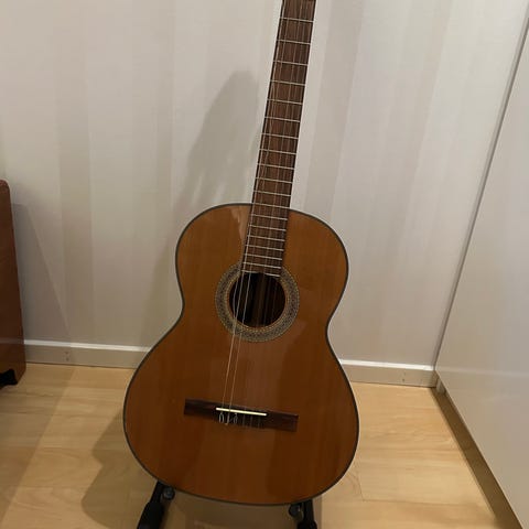 Mycket fin Bjärton klassisk akustisk gitarr från 1975. Gitarren har nya nylonsträngar, traditionell spansk huvud och den typiska dekorativa rosetten runt ljudhålet. Locket i massiv gran. Sidor, botten och hals i mahogny. Greppbrädan är i rosenträ. Mycket lättspelad, bra stränghöjd och rak hals. Överlag mycket välbevarad med enbart diskreta bruksspår. Mycket fin klang. Nyligen gjort setup med nya strängar, rengöring, inoljad greppbräda.
