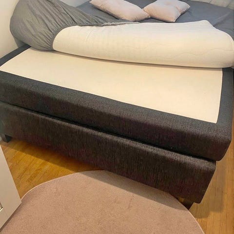 Ljusgrå kontinentalsäng i jättefint skick med förvaringsutrymme i mellanmadrassen. Djur och rökfri. Mediumfast, bäddmadrass fås med gratis om man vill ha den. Jag kör hem sängen gratis till dig inom Göteborg ifall du inte har tillgång till egen transport.