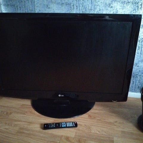 LG tv i svart utförande. Platt skärm med bordsstativ. På baksidan finns flera anslutningar, bland annat HDMI, komponent- och kompositingångar samt antennanslutning. Passar för användning som vanlig tv eller extern skärm till exempelvis digitalbox eller annan mediespelare.