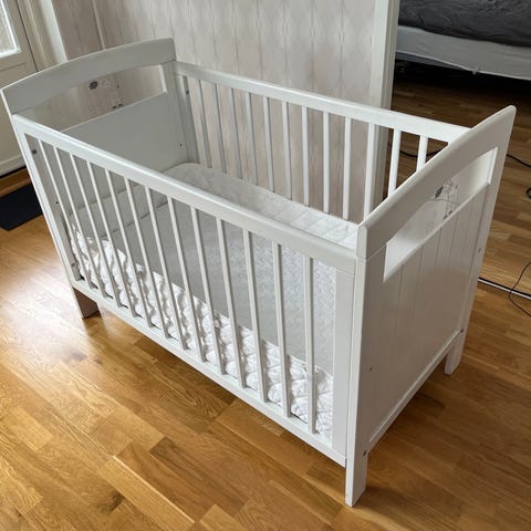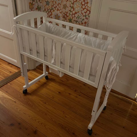Bedsidecrib från troll inkl. Madrass och överdrag samt spjälsängsskydd (notera att det inte är något spjälsängsskydd för långsidan som går att dra ner).