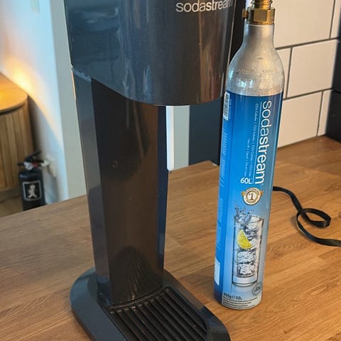 Sodastream kolsyremaskin i mörkgrå färg. Maskinen är designad för att enkelt förvandla vanligt vatten till kolsyrat vatten. Den har en kompakt design som passar bra på köksbänken.