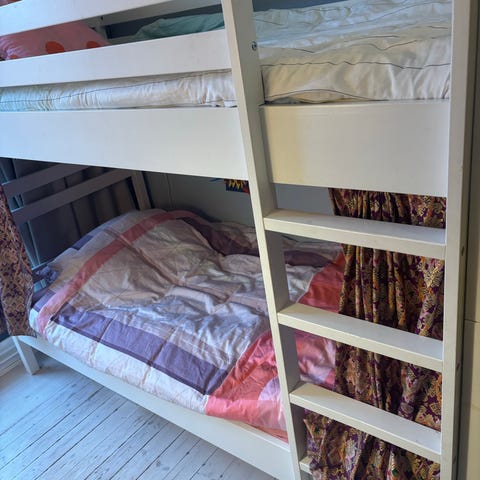 Våningssäng i metallvit med två madrasser