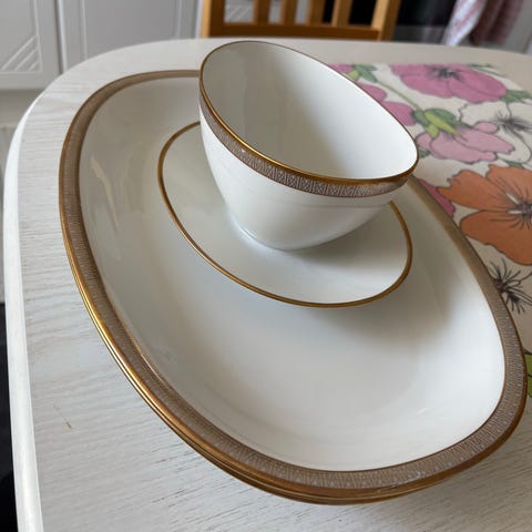 5st djupa tallrikar från Rörstrand - Gala Design Louise Adelborg. Djupa tallrikar i vitt porslin med mönster och kant i äkta guld.