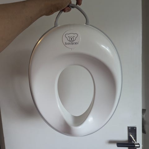 Babybjörn potta ich toalettsits i grå och vit plast.