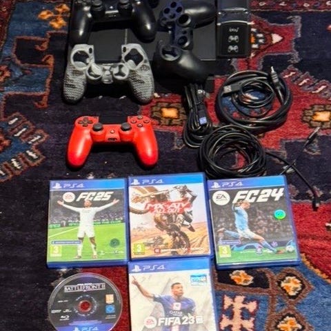 Sony Playstation 4 PRO spelkonsol i svart utförande. Konsolen visas tillsammans med två trådlösa handkontroller (en blå och en svart) samt flera spel på skiva vart av du kan få välja (några) spel att följa med. Säljer även ett annat plantation lite nyare och bättre. Tillbehör som laddare och uttag följs med. Skriv gärna vid frågor!
