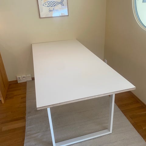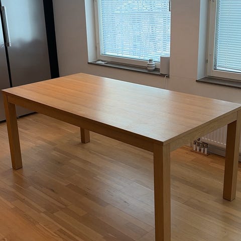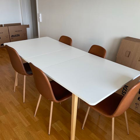 Bordet ör 170cm långt och det finns två iläggsskivor a 50cm, så kan bli totalt 270cm långt (endast 1 skiva med på bilden)