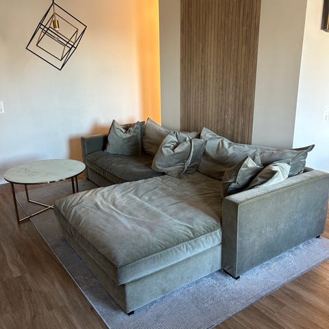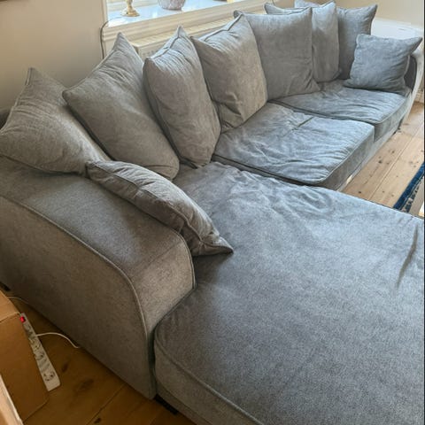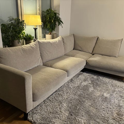 Soffa från mio säljes, Rossi 4-sits med divan vänster i tyget zoom azur. Soffan är levererad och uppackad i november, sparsamt använd och i princip sprillans. Det är en superstor soffa på 380cm bredd, står att den är för 8pers men vi har definitivt suttit 10/11st i den samtidigt utan problem. Säljes pågrund av flytt till mindre lägenhet✨