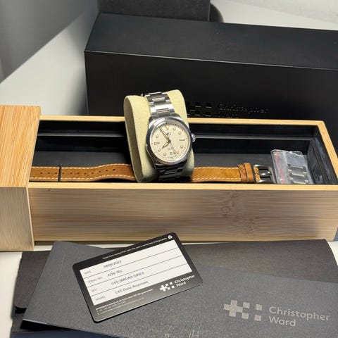 Klockan skickades från Christopher Ward den 13 februari 2026 och omfattas av 5 års garanti. Den levererades igår och är helt oanvänd, endast uppackad för kontroll och fotografering.