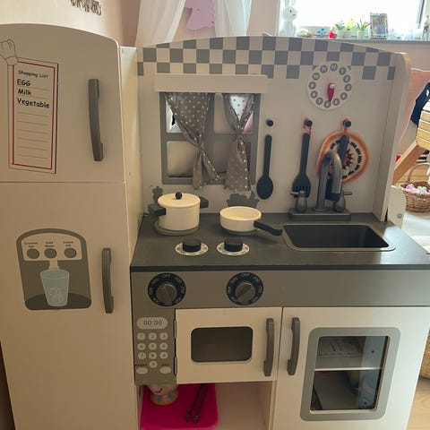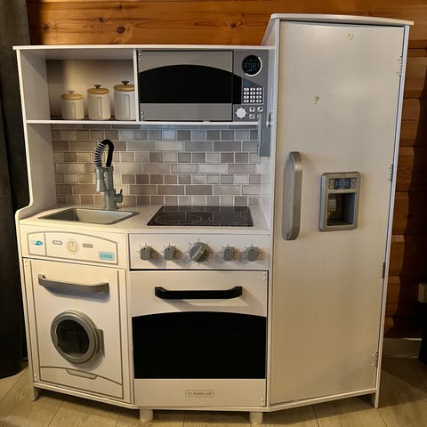 Ett kök med massor av tillbehör i kanonskick förrutom en spricka på spishället. Annars funkar allt som ljudeffekter, luckor, knappar mm vanligt