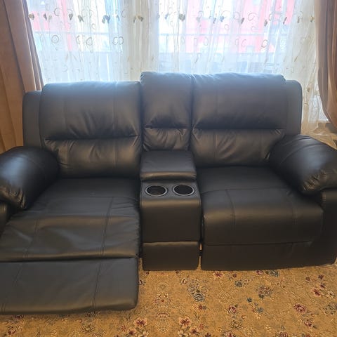 Hemmabio eller relaxsoffa med stor fotpall med stor förvaring. Samt 2 extra förvaringsutrymme och 4 mugghållare. 4-5 platser varav 2 fällbara. Generellt fint skick finns ett skavmärke på ryggen. Samt lite tecken på användning. Köpt på Mio för 19000 för några år sedan. Säljes p.g.a rummet skall byta funktion. Delbar i flera sektioner vilket gör flytt lättare. Kan inte stå för bärhjälp p.g.a operation. Lågt pris på grund av att vi vill komma igång med renovering.