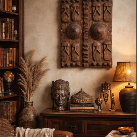 Buddha-huvud i trä & dekorationsfågel i återvunnen metall.