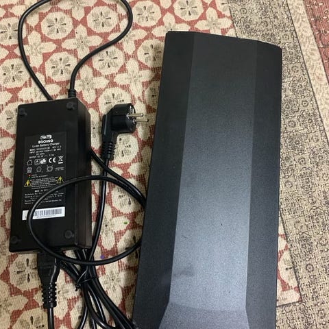 Batteri till elcykel i svart färg med tillhörande laddare. Batteriet har indikatorlampor för laddningsnivå på ovansidan. Passar som reserv- eller utbytesbatteri till kompatibla elcyklar.
